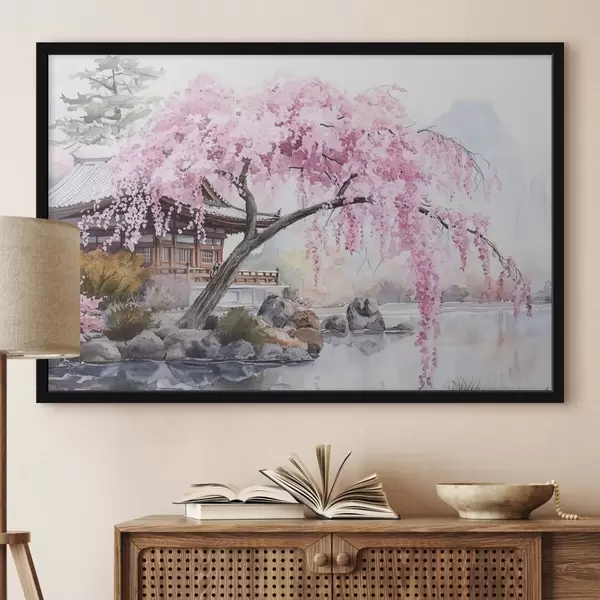 Plakatas Rožinis vyšnių medis prie namo ant ežero, Japonija, rytietiškas, akvarelės stilius Ne f44312