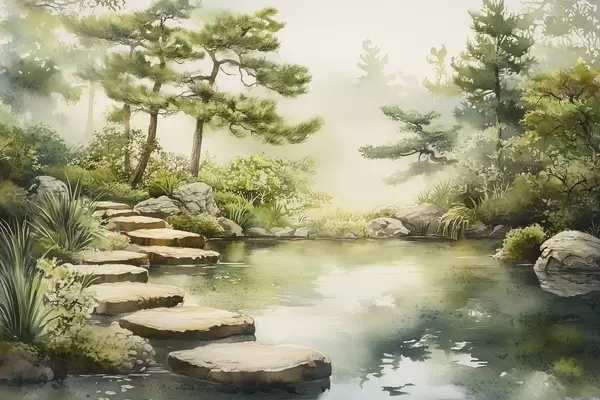 Plakatas Rytietiškas sodas su ežeru ir medžiais, gamta, akvarelės stilius f44313