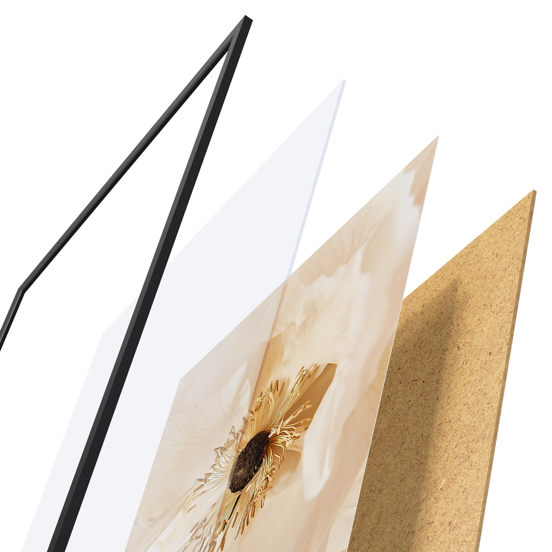 Plakatą sudaro rėmas, pleksiklas, atspausdintas vaizdas ir medžio drožlių plokštės pagrindas. Plakatą galima iš karto pakabinti ant sienos dėl kitoje pusėje esančių laikiklių.