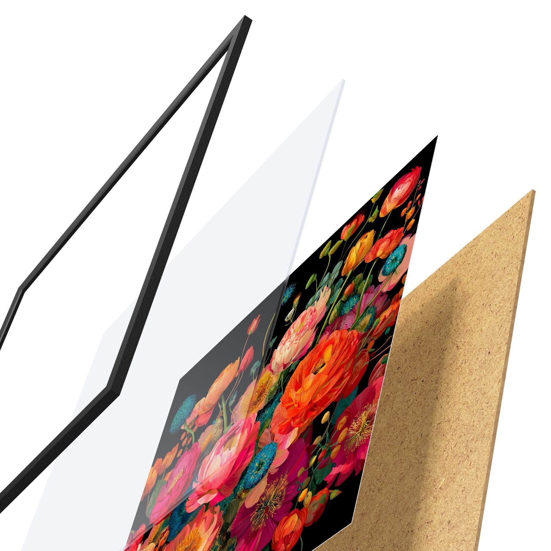 Plakatą sudaro rėmas, pleksiklas, atspausdintas vaizdas ir medžio drožlių plokštės pagrindas. Plakatą galima iš karto pakabinti ant sienos dėl kitoje pusėje esančių laikiklių.