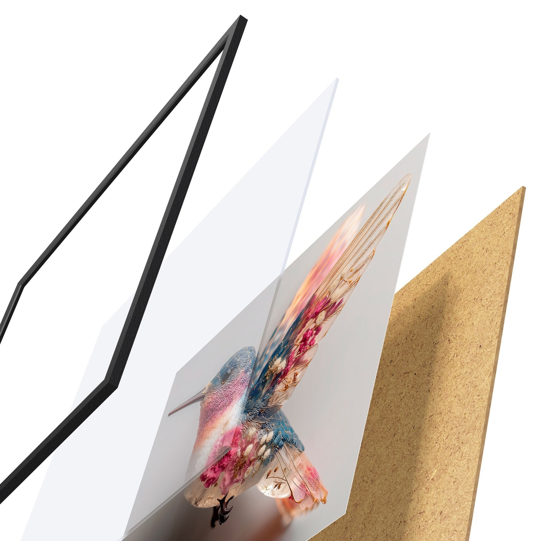 Plakatą sudaro rėmas, pleksiklas, atspausdintas vaizdas ir medžio drožlių plokštės pagrindas. Plakatą galima iš karto pakabinti ant sienos dėl kitoje pusėje esančių laikiklių.
