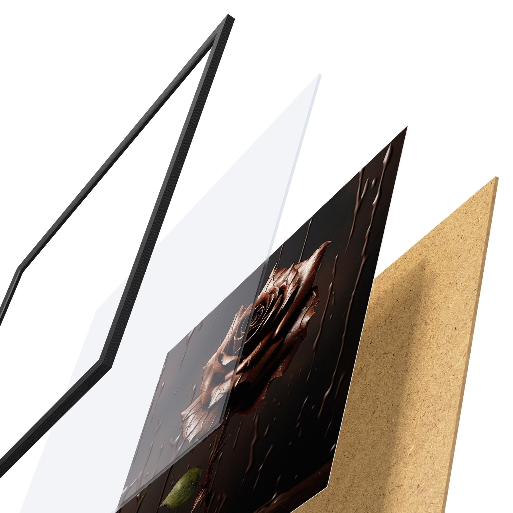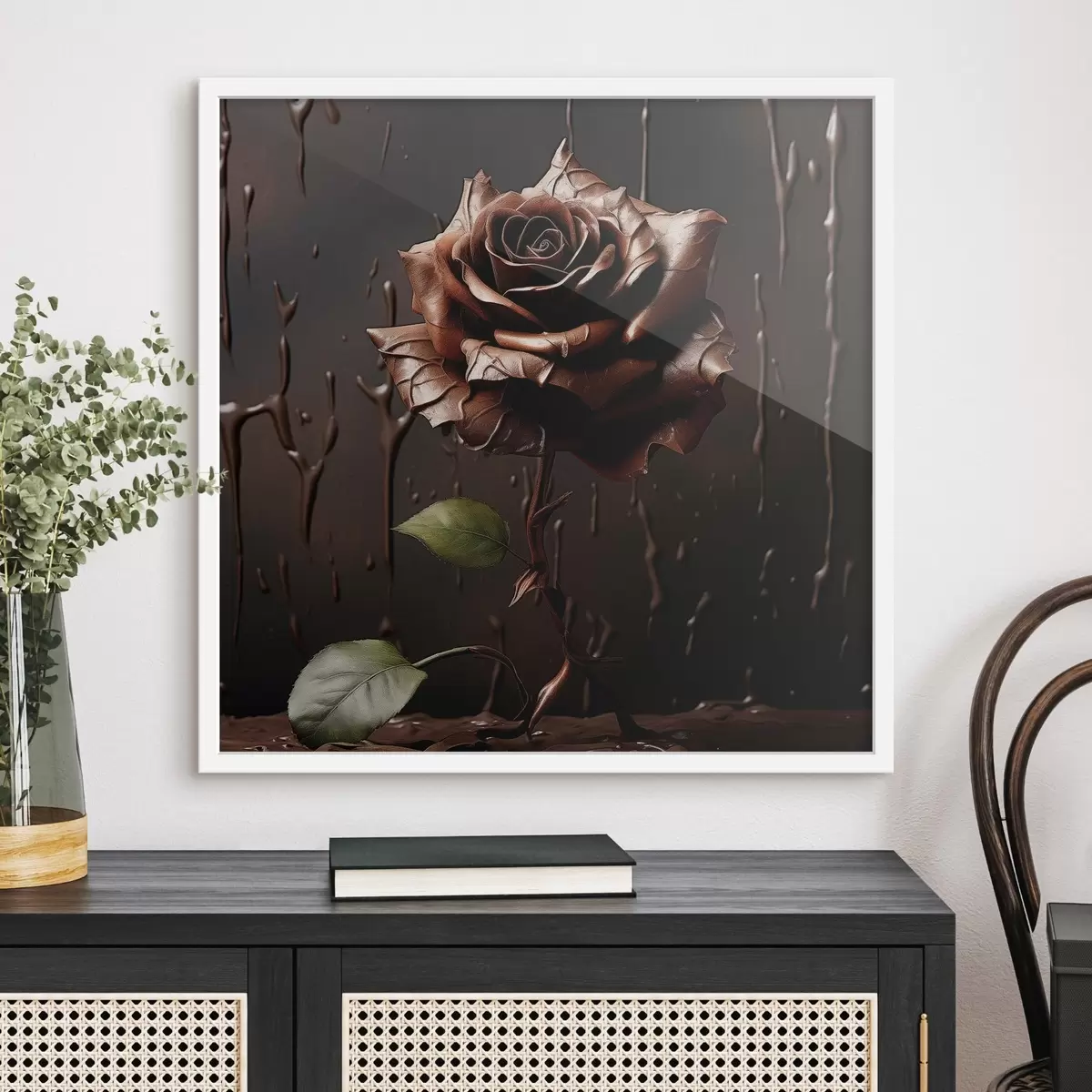 Plakatas Ruda rožė tamsiame fone su šokolado purslais f44381