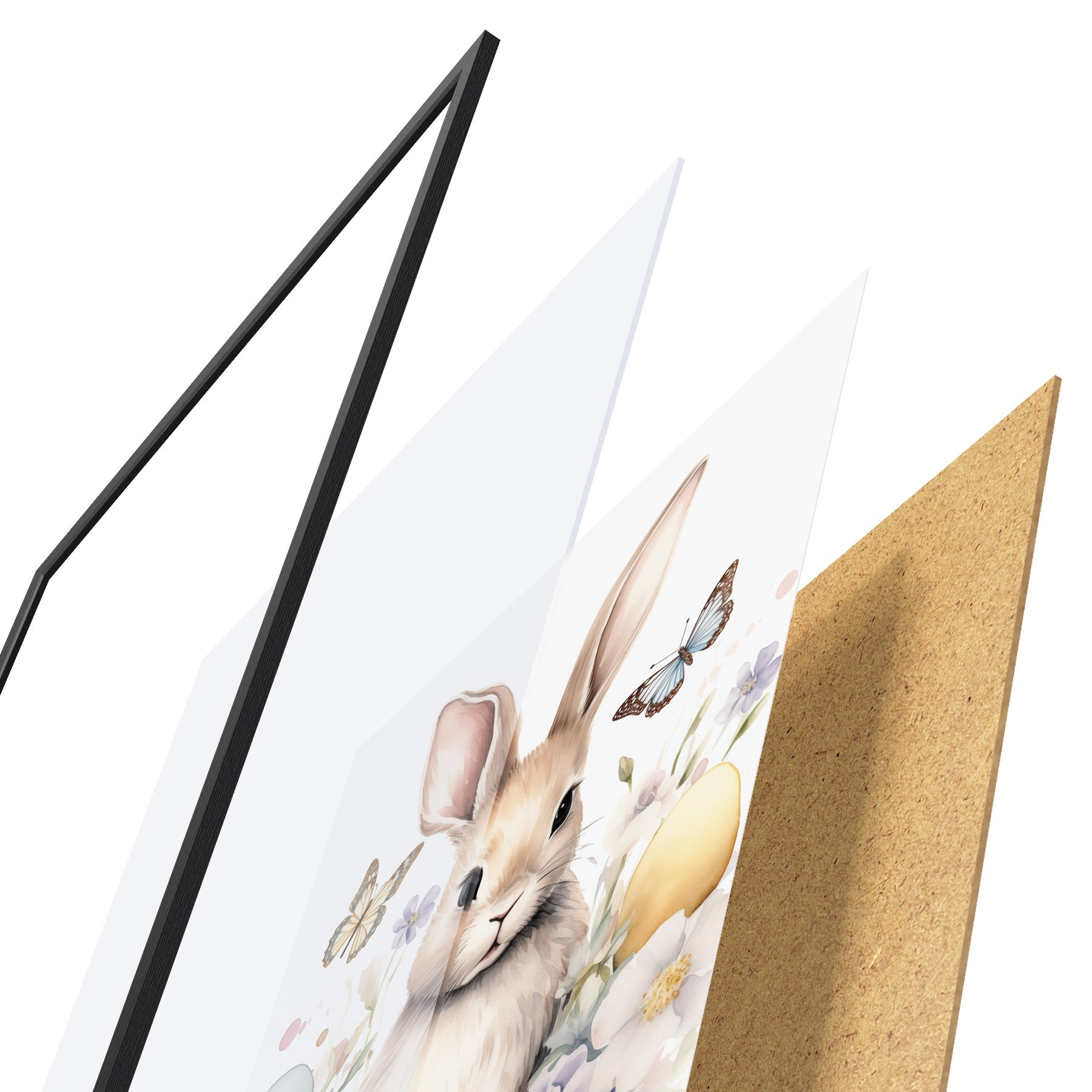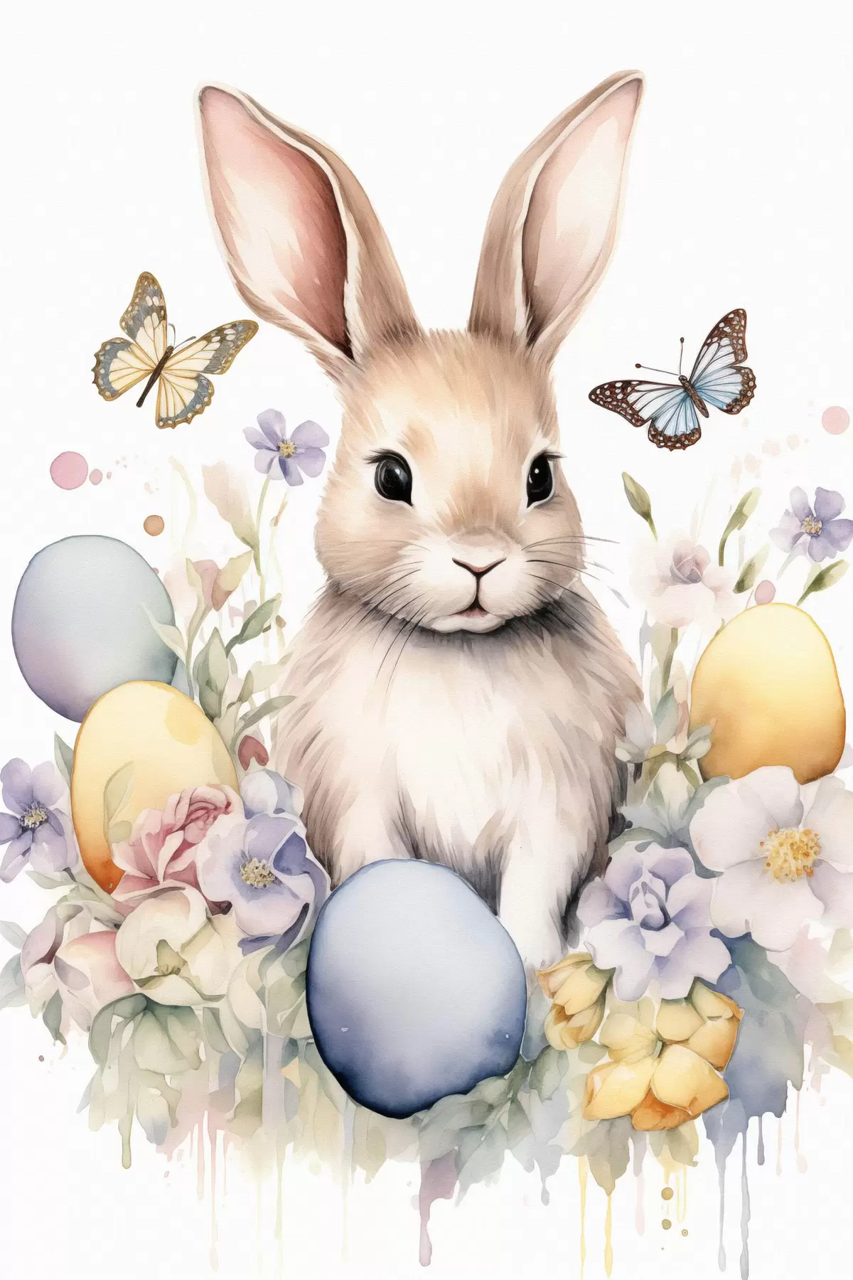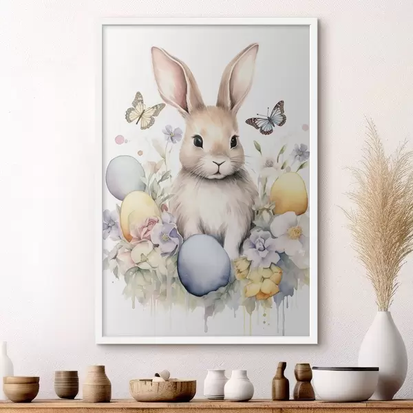 Plakatas Mielas akvarelės stiliaus zuikutis gėlėse su drugeliais Ne f44388