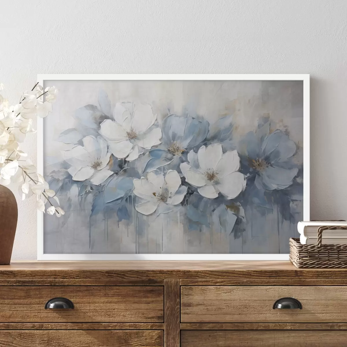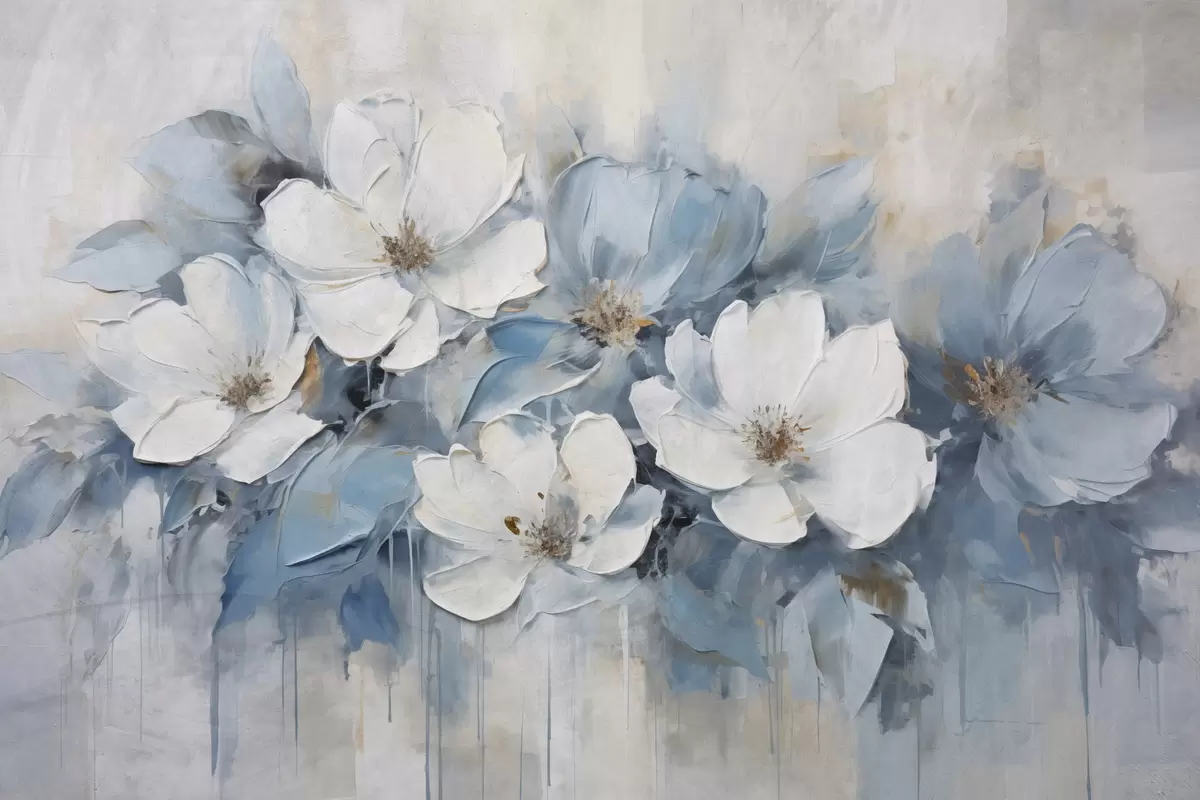 Plakatas Baltos gėlės su mėlynais lapais šviesiai smėlio spalvos fone, su matomais teptuko potėpiais f44395