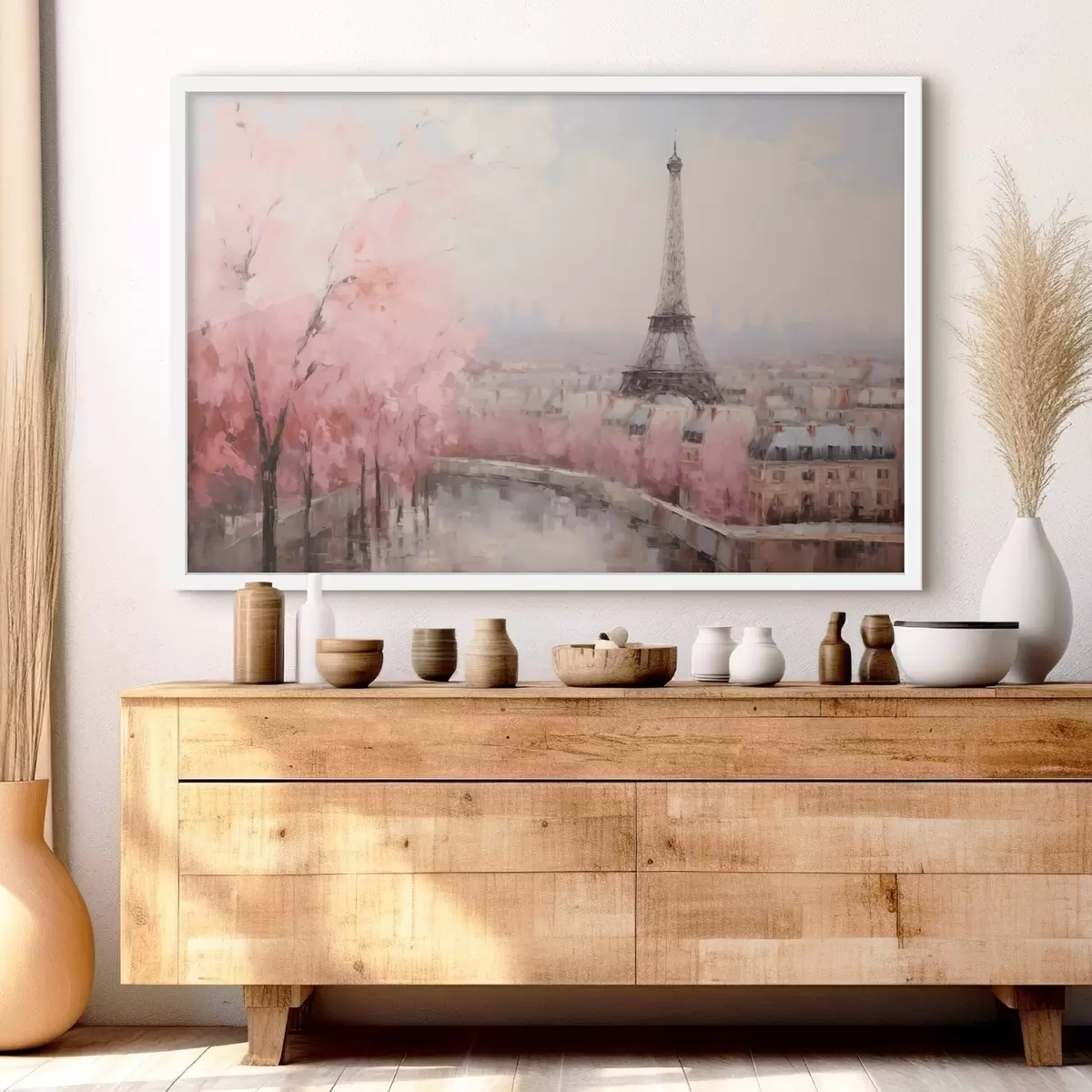 Plakatas Eifelio bokštas Paryžiuje su pavasarį žydinčiomis vyšniomis, švelnios pastelinės spalvos f44398