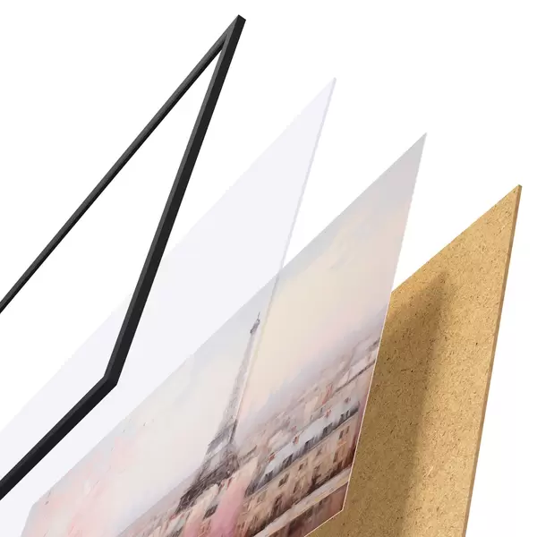 Plakatą sudaro rėmas, pleksiklas, atspausdintas vaizdas ir medžio drožlių plokštės pagrindas. Plakatą galima iš karto pakabinti ant sienos dėl kitoje pusėje esančių laikiklių.