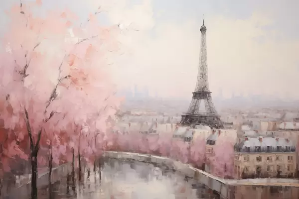 Plakatas Eifelio bokštas Paryžiuje su pavasarį žydinčiomis vyšniomis, švelnios pastelinės spalvos f44398