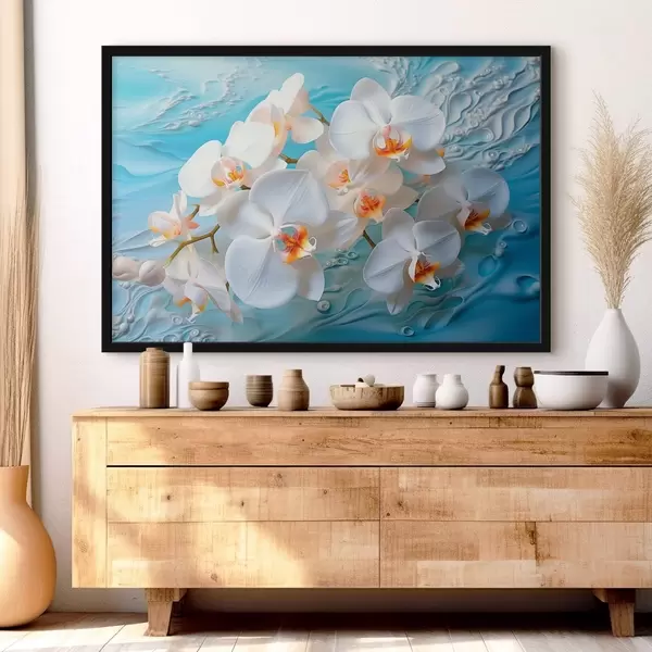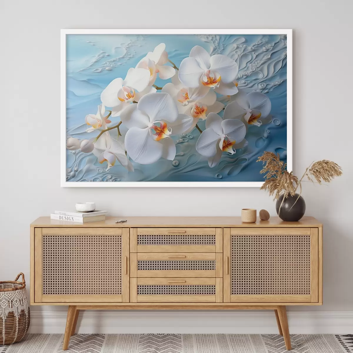 Plakatas Baltos orchidėjos, išdėstytos ant šviesiai mėlyno paviršiaus su vandens lašeliais, švelnus apšvietimas f44401