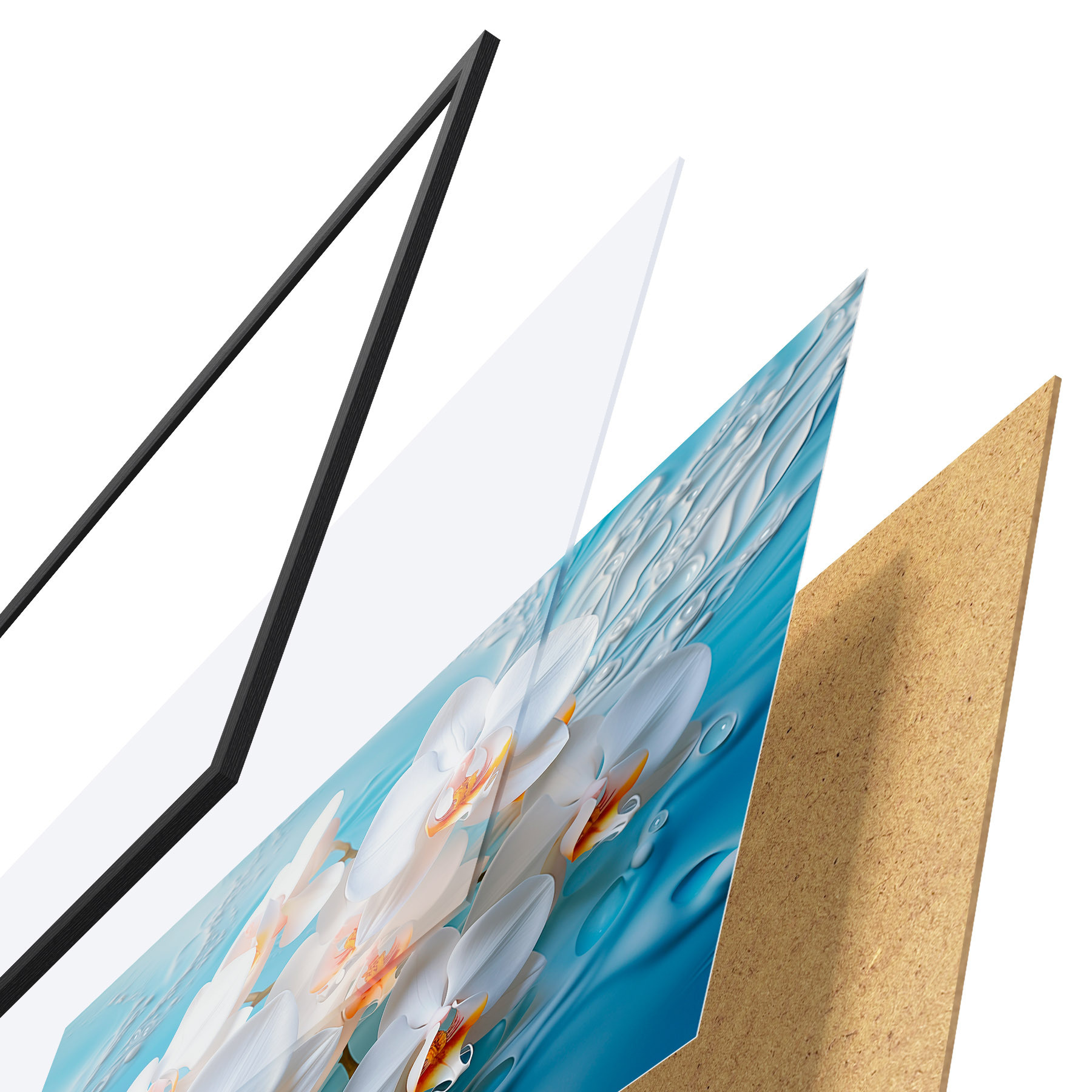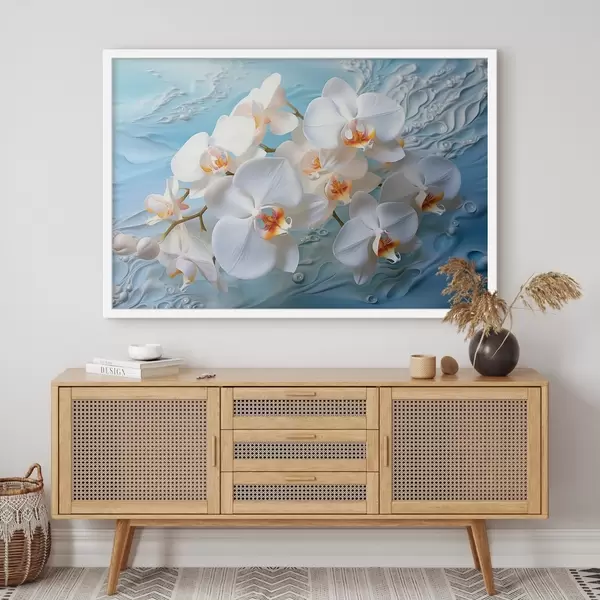 Plakatas Baltos orchidėjos, išdėstytos ant šviesiai mėlyno paviršiaus su vandens lašeliais, švelnus apšvietimas Ne f44401