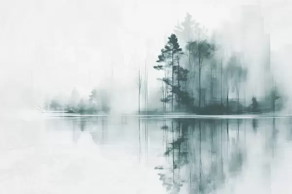 Plakatas Abstraktus miškas su aukštais medžiais, atsispindinčiais vandenyje, prislopinta spalvų paletė Ne f44403