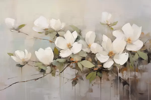 Plakatas Baltos magnolijos žiedai su žaliais lapais ant šakos, švelnūs potėpiai, prislopintos spalvos Ne f44404