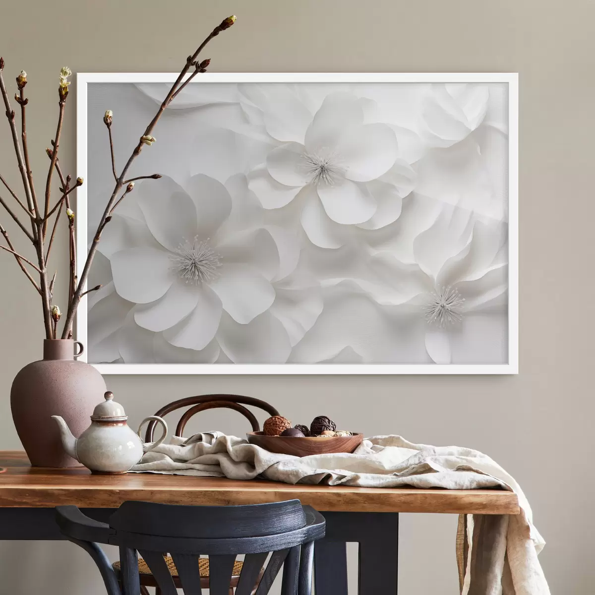 Plakatas Baltos dekoratyvinės gėlės su subtiliais žiedlapiais ir įmantriais kuokeliais f44406