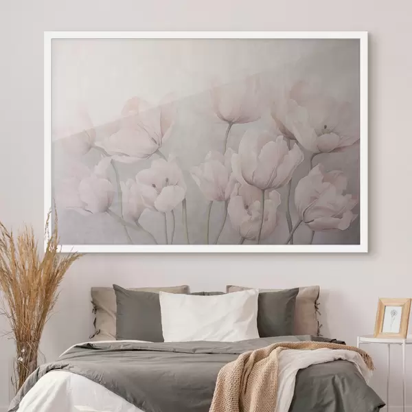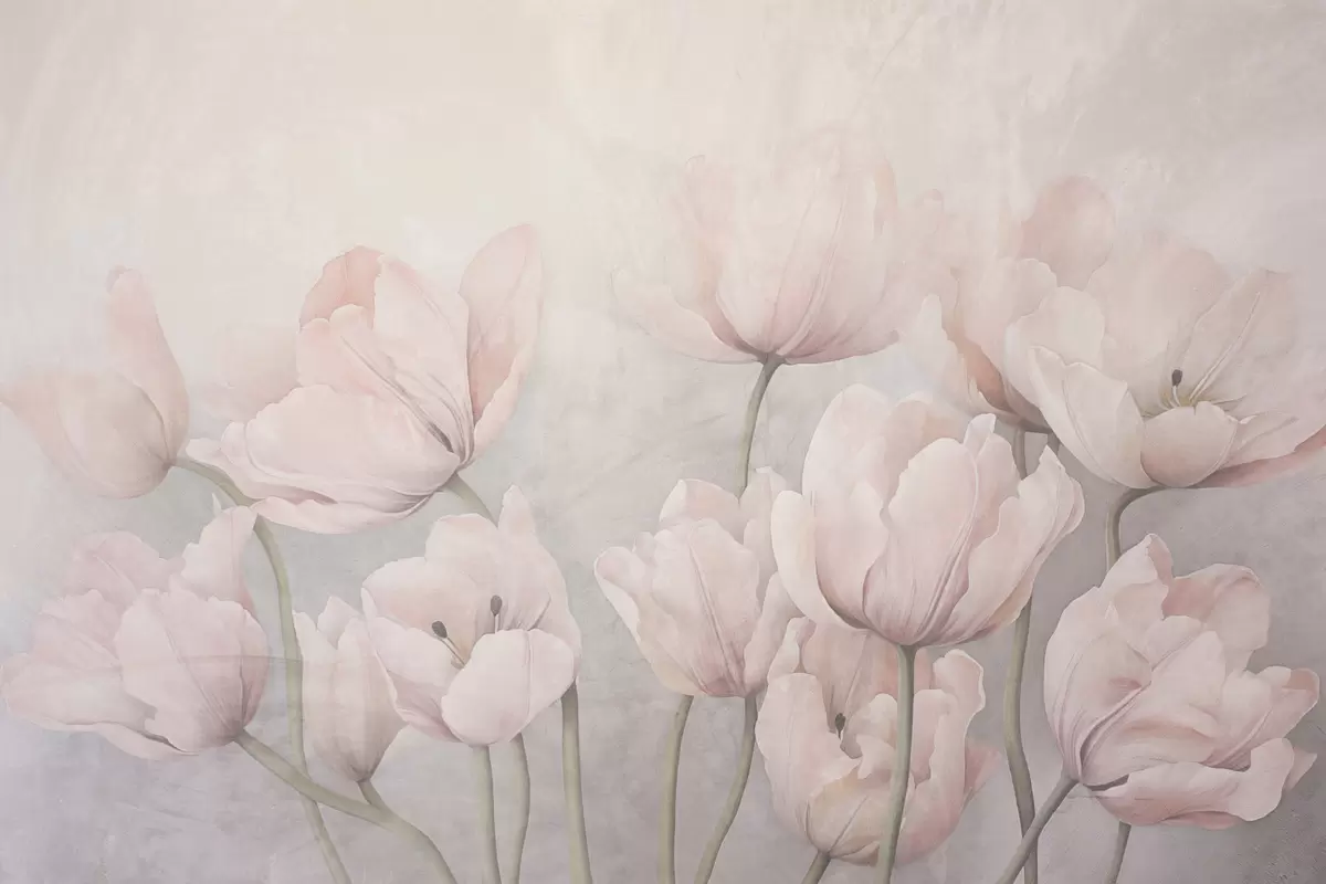 Plakatas Senovinės tekstūruotos rožinės tulpės ilgais stiebais, švelnios prislopintos spalvos, šviesiai pilkas fonas f44407