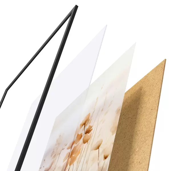 Plakatą sudaro rėmas, pleksiklas, atspausdintas vaizdas ir medžio drožlių plokštės pagrindas. Plakatą galima iš karto pakabinti ant sienos dėl kitoje pusėje esančių laikiklių.
