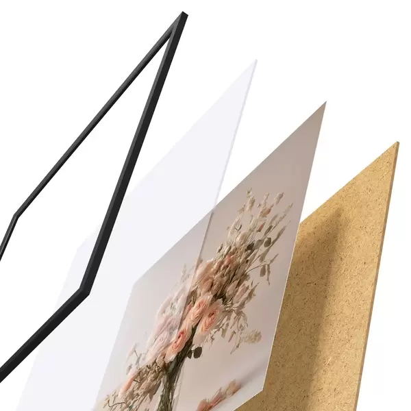 Plakatą sudaro rėmas, pleksiklas, atspausdintas vaizdas ir medžio drožlių plokštės pagrindas. Plakatą galima iš karto pakabinti ant sienos dėl kitoje pusėje esančių laikiklių.