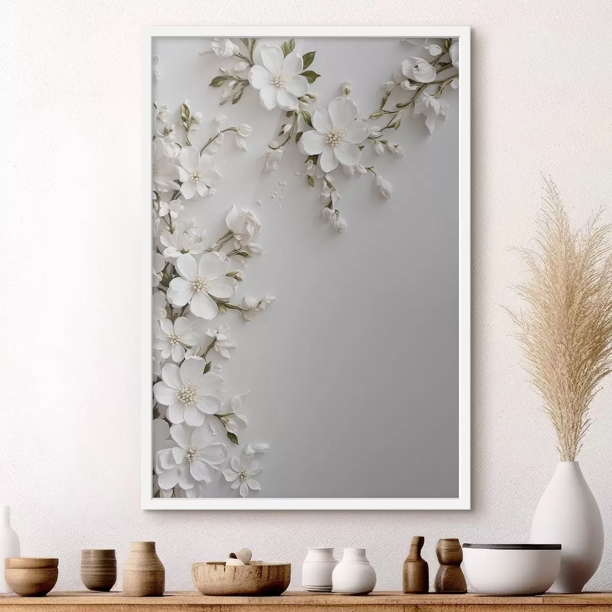 Plakatas Baltos gėlės ant baltos sienos fone f44466