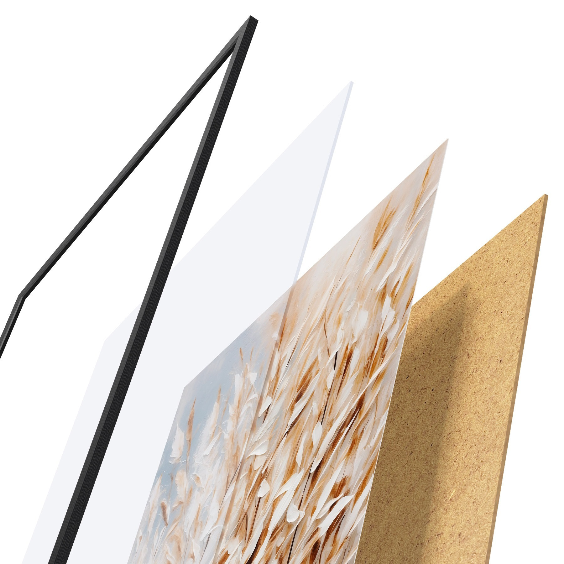 Plakatą sudaro rėmas, pleksiklas, atspausdintas vaizdas ir medžio drožlių plokštės pagrindas. Plakatą galima iš karto pakabinti ant sienos dėl kitoje pusėje esančių laikiklių.
