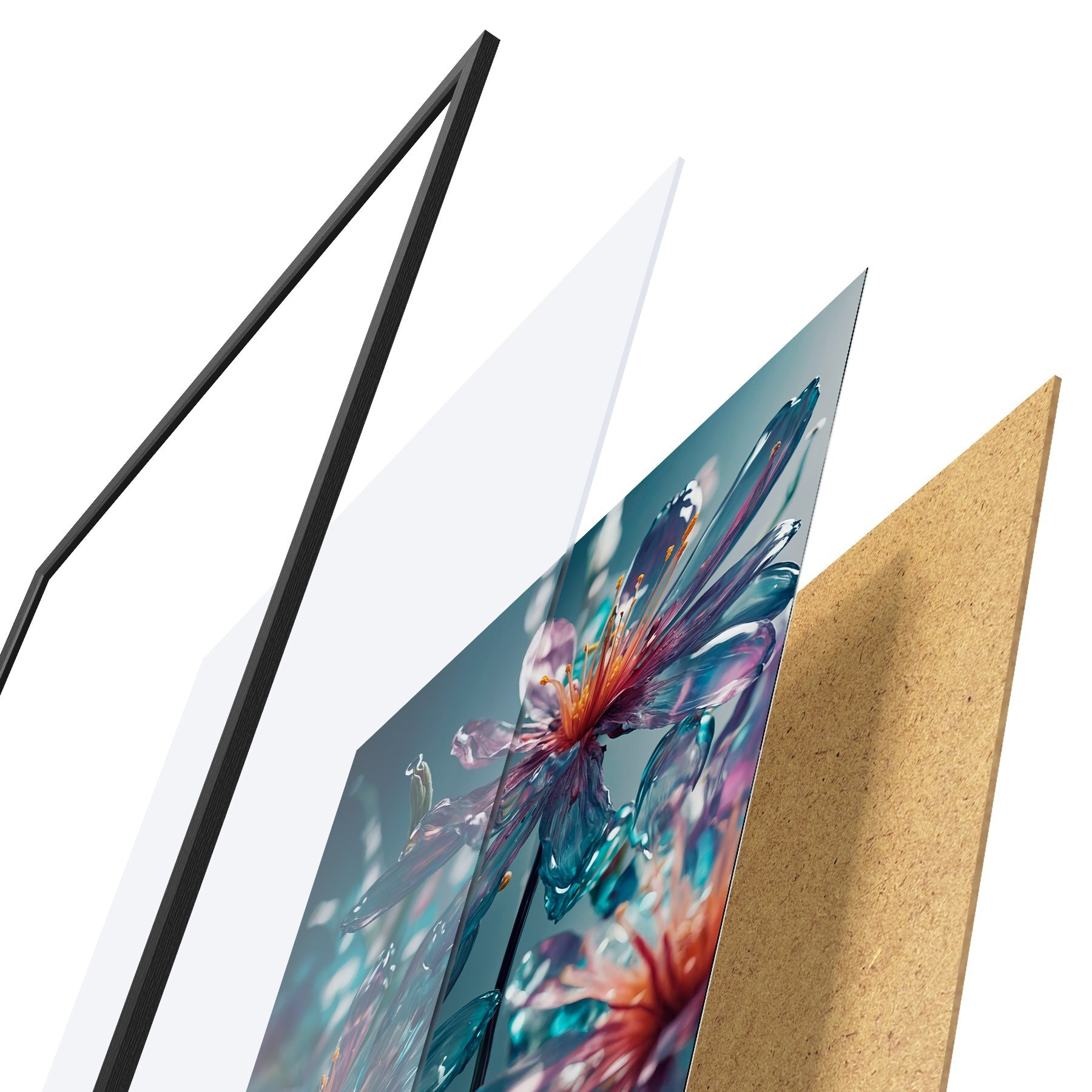 Plakatą sudaro rėmas, pleksiklas, atspausdintas vaizdas ir medžio drožlių plokštės pagrindas. Plakatą galima iš karto pakabinti ant sienos dėl kitoje pusėje esančių laikiklių.