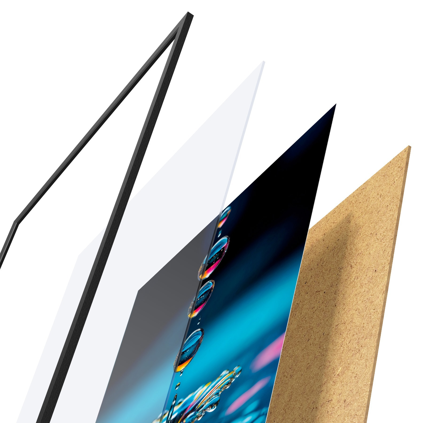 Plakatą sudaro rėmas, pleksiklas, atspausdintas vaizdas ir medžio drožlių plokštės pagrindas. Plakatą galima iš karto pakabinti ant sienos dėl kitoje pusėje esančių laikiklių.
