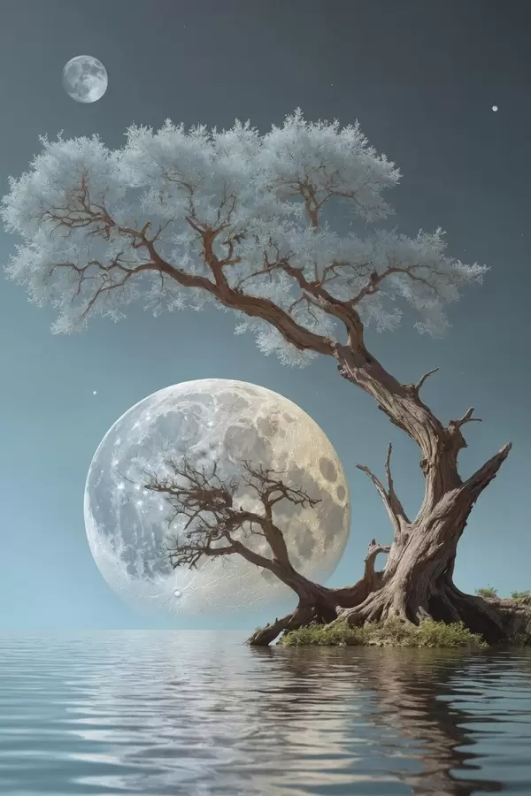 Plakatas Ežero viduryje augantis medis mėnulio fone f44481