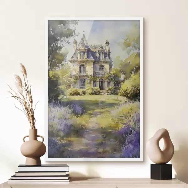 Plakatas Prancūzijos kaimo namelis, akvarelės stilius, levandų laukai Ne f44501