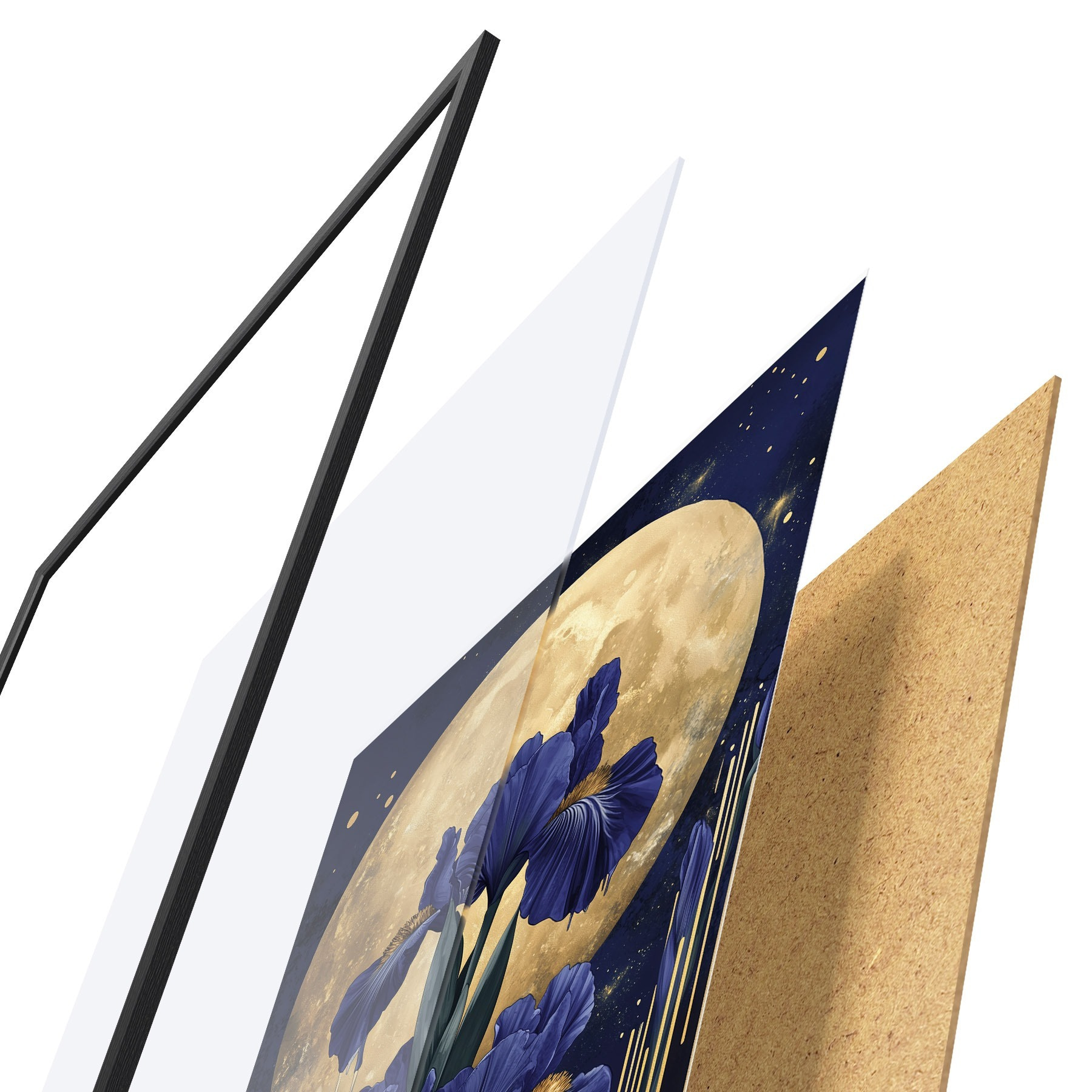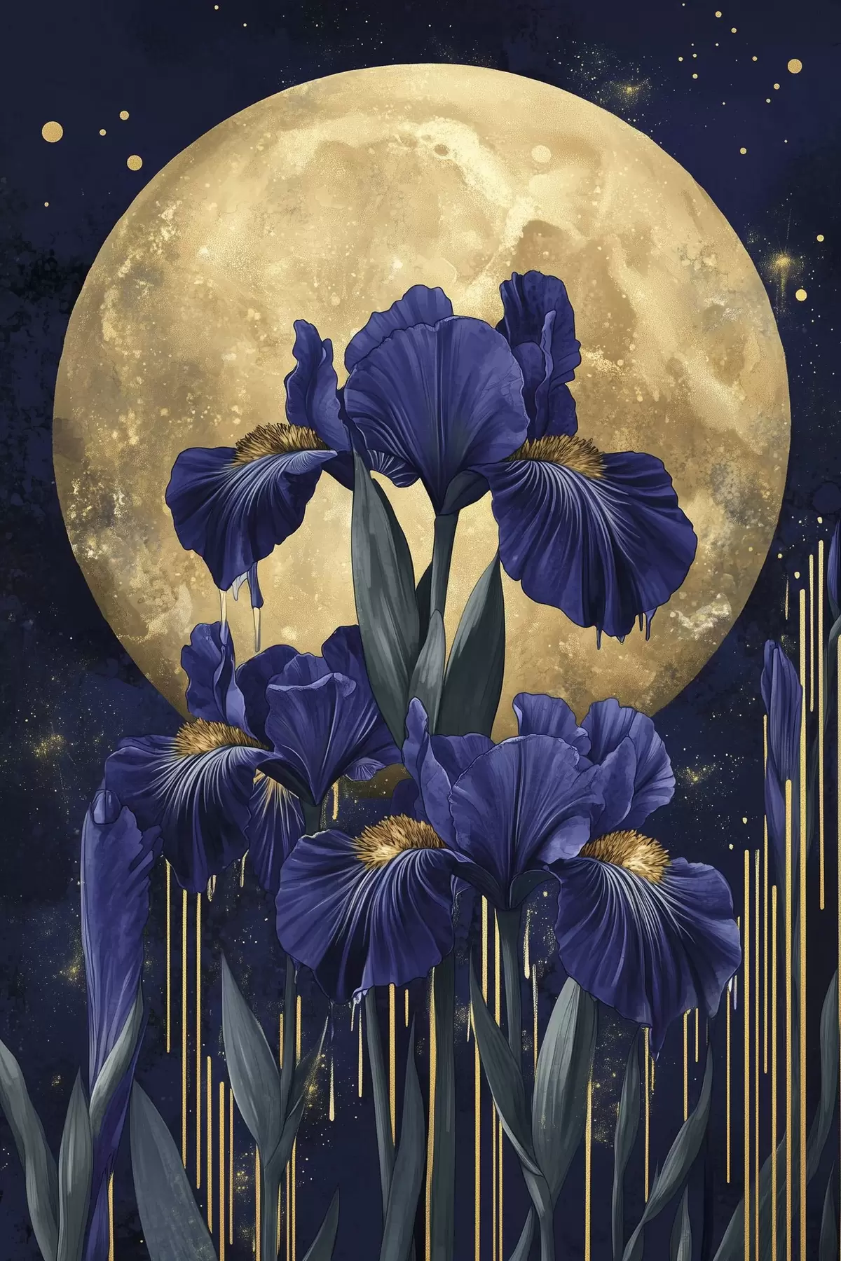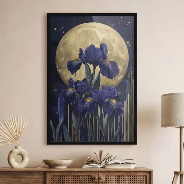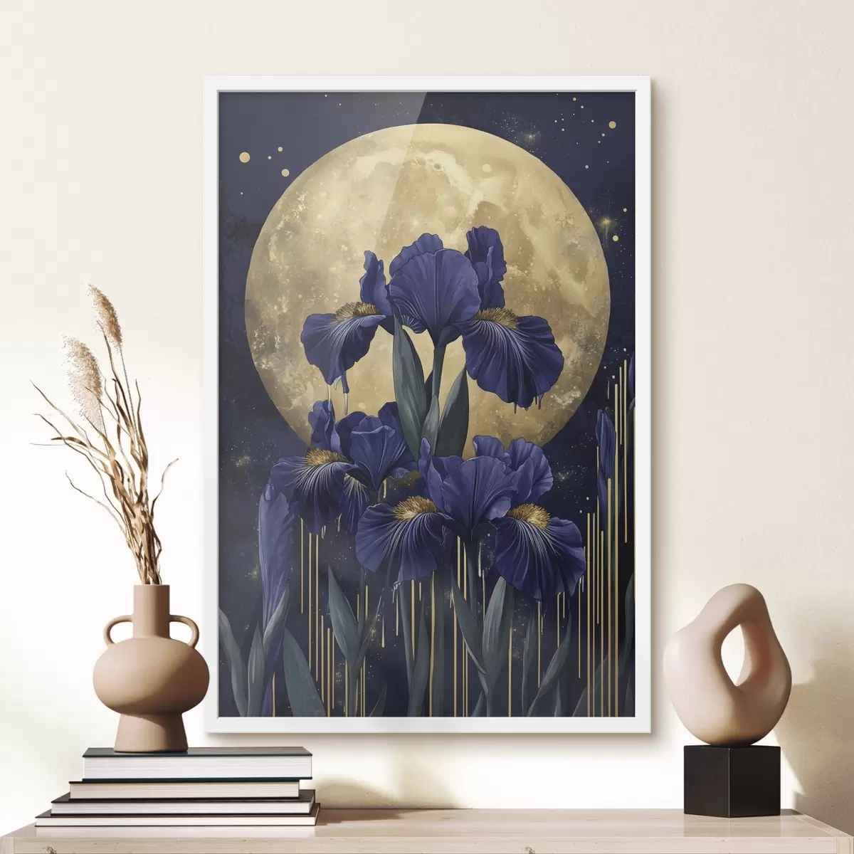 Plakatas Irisų gėlės, šviečiantis mėnulis, naktinis dangus, mėlynos spalvos f44510