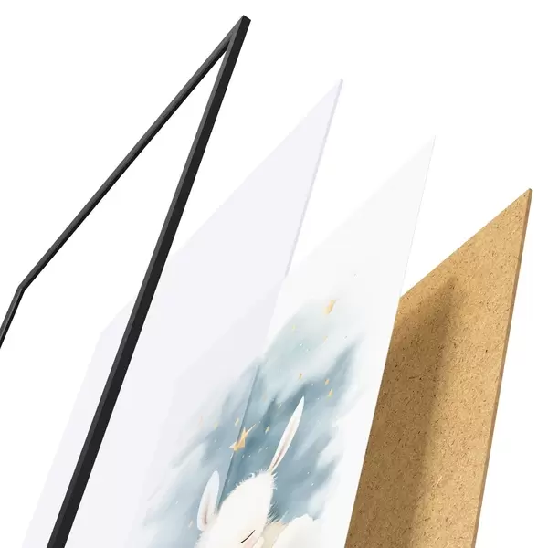 Plakatą sudaro rėmas, pleksiklas, atspausdintas vaizdas ir medžio drožlių plokštės pagrindas. Plakatą galima iš karto pakabinti ant sienos dėl kitoje pusėje esančių laikiklių.