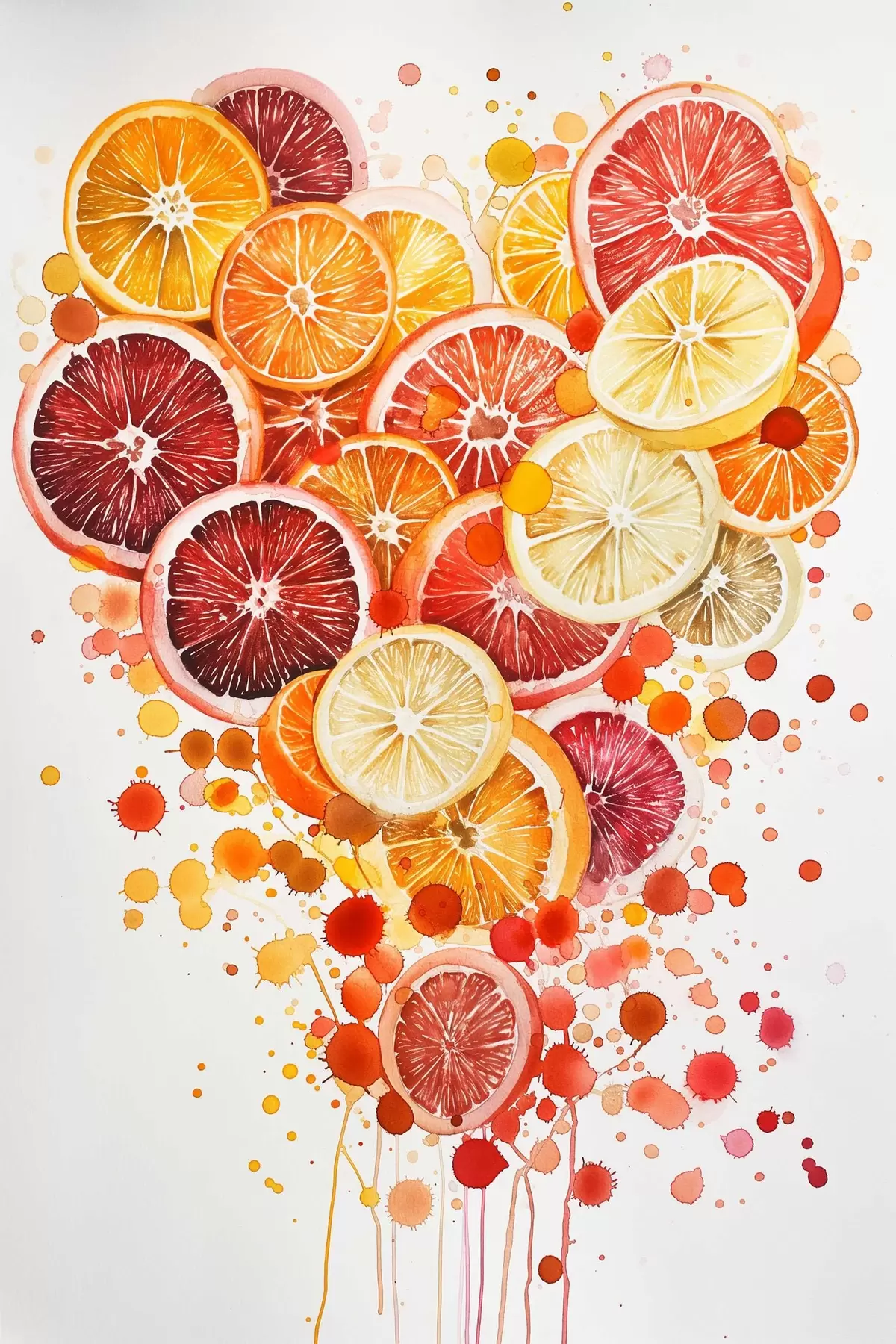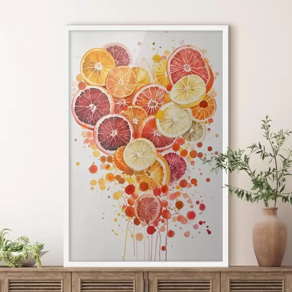 Plakatas Žaisminga citrinos, apelsino, greipfruto ir laimo griežinėlių kompozicija širdies forma f44545