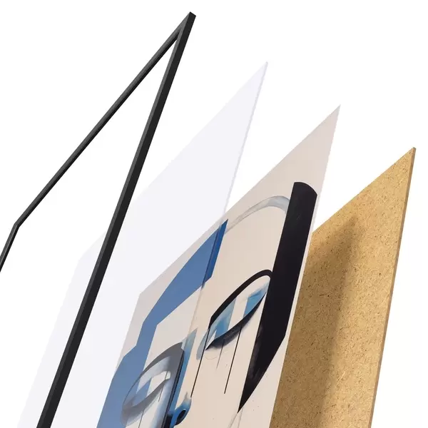 Plakatą sudaro rėmas, pleksiklas, atspausdintas vaizdas ir medžio drožlių plokštės pagrindas. Plakatą galima iš karto pakabinti ant sienos dėl kitoje pusėje esančių laikiklių.