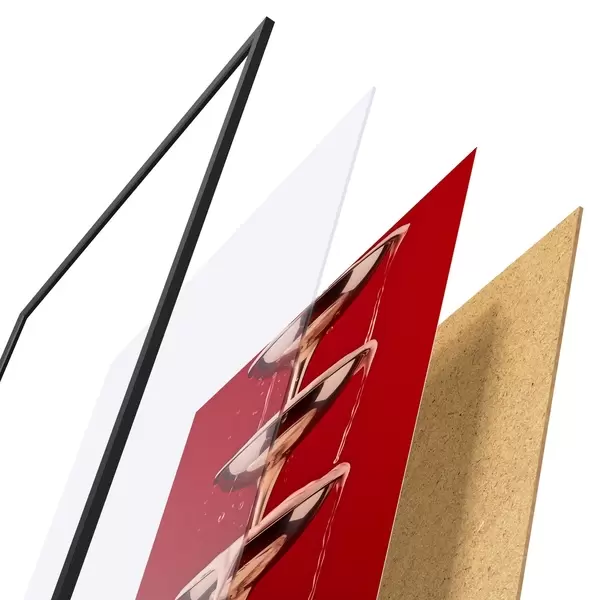 Plakatą sudaro rėmas, pleksiklas, atspausdintas vaizdas ir medžio drožlių plokštės pagrindas. Plakatą galima iš karto pakabinti ant sienos dėl kitoje pusėje esančių laikiklių.