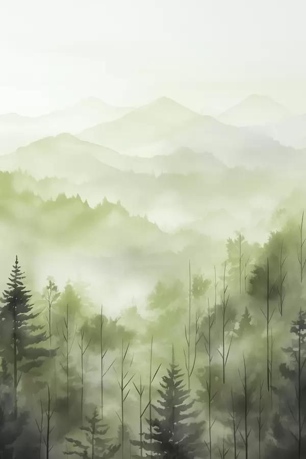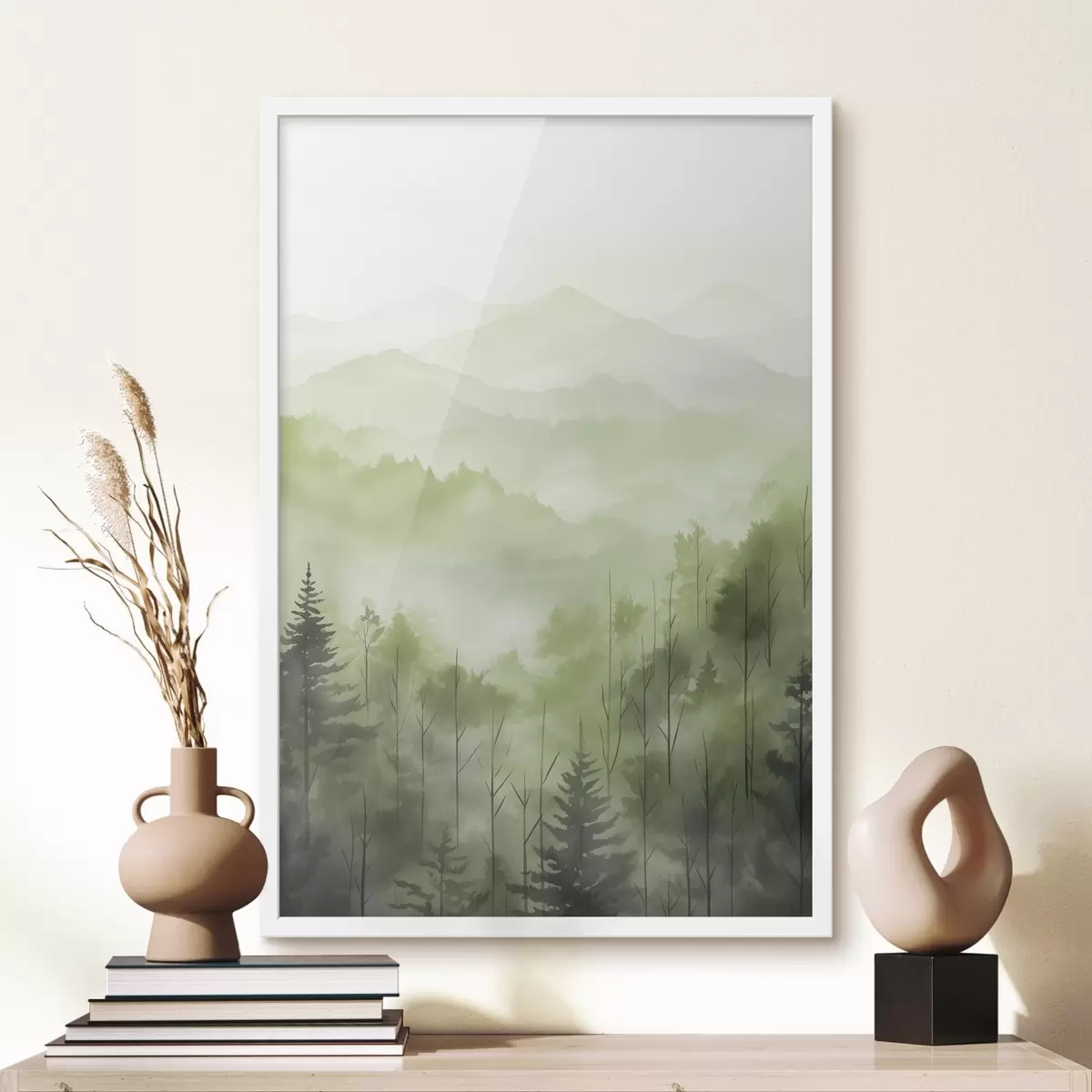 Plakatas Kalnai su miško kraštovaizdžiu, žalios spalvos, akvarelės stilius Ne f44606