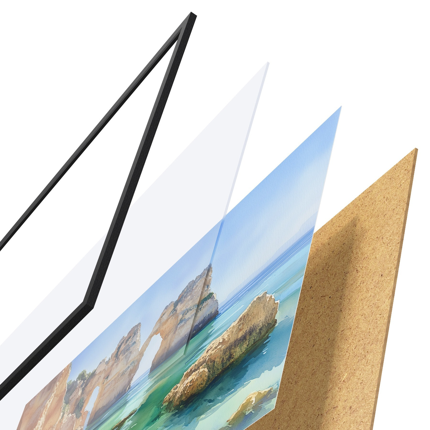Plakatą sudaro rėmas, pleksiklas, atspausdintas vaizdas ir medžio drožlių plokštės pagrindas. Plakatą galima iš karto pakabinti ant sienos dėl kitoje pusėje esančių laikiklių.