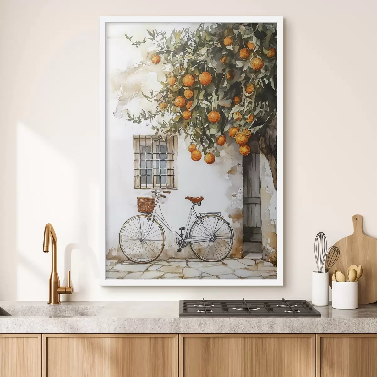 Plakatas Viduržemio jūros regiono baltas namas su apelsinmedžiu ir dviračiu f44610