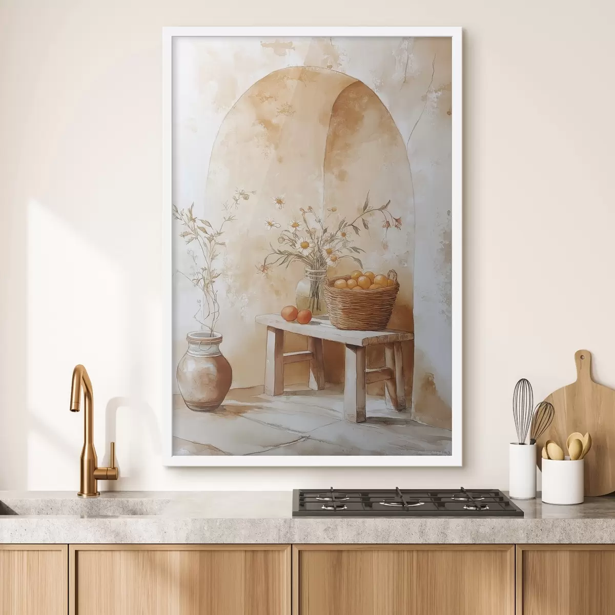 Plakatas Arkinė siena su antikvariniu stiklainiu, ramunėlių gėlėmis ir apelsinų krepšeliu Ne f44613