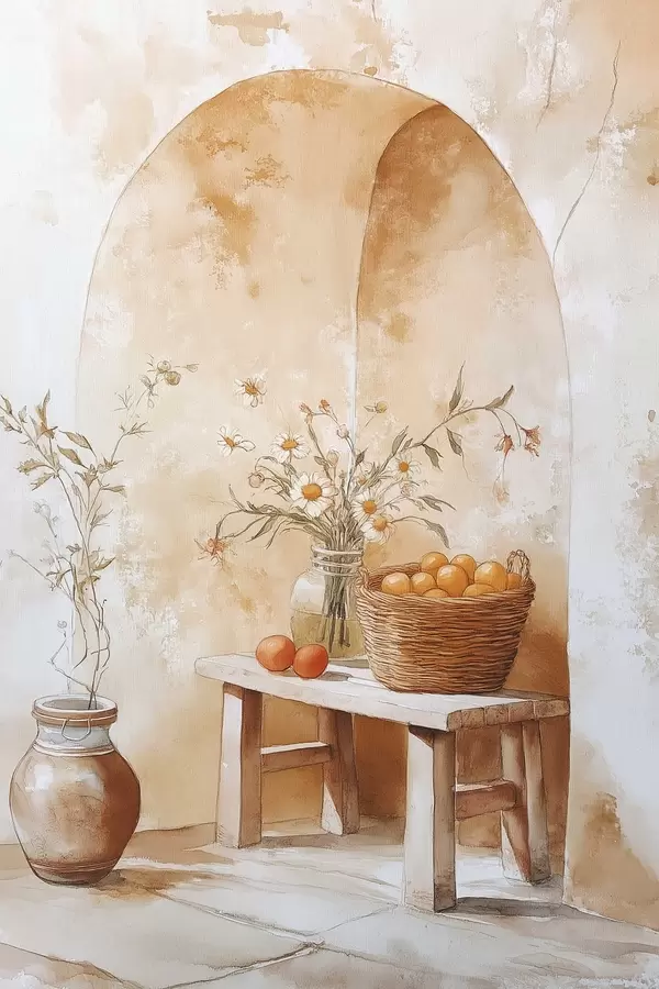 Plakatas Arkinė siena su antikvariniu stiklainiu, ramunėlių gėlėmis ir apelsinų krepšeliu f44613