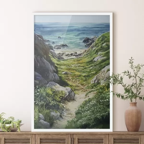 Plakatas Jūros pakrantė su akmenimis ir žalia žole, akvarelės stilius, vasara Ne f44616