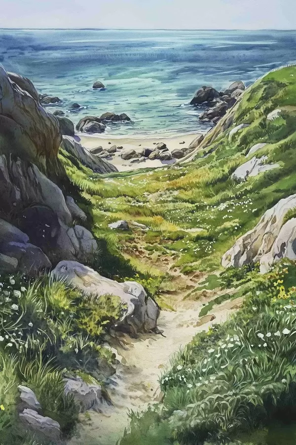 Plakatas Jūros pakrantė su akmenimis ir žalia žole, akvarelės stilius, vasara Ne f44616