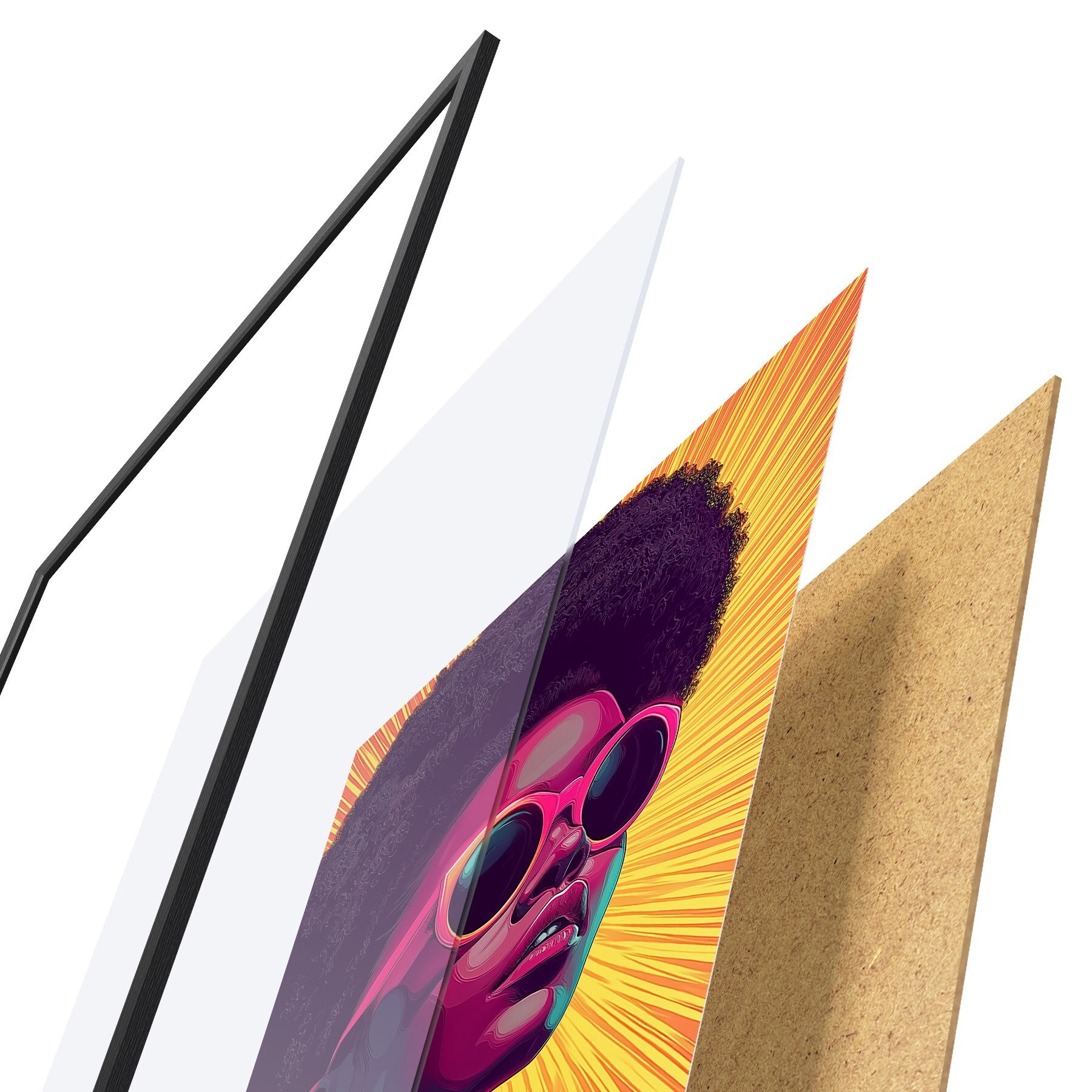 Plakatą sudaro rėmas, pleksiklas, atspausdintas vaizdas ir medžio drožlių plokštės pagrindas. Plakatą galima iš karto pakabinti ant sienos dėl kitoje pusėje esančių laikiklių.