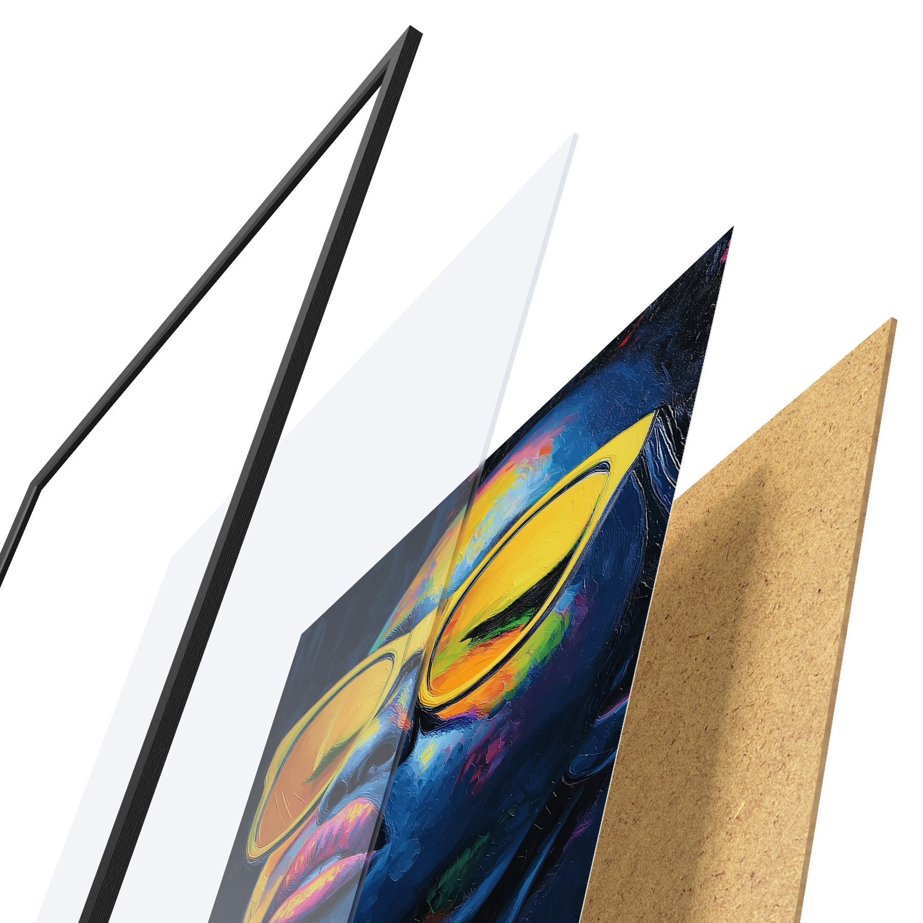 Plakatą sudaro rėmas, pleksiklas, atspausdintas vaizdas ir medžio drožlių plokštės pagrindas. Plakatą galima iš karto pakabinti ant sienos dėl kitoje pusėje esančių laikiklių.