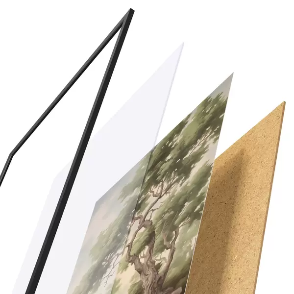 Plakatą sudaro rėmas, pleksiklas, atspausdintas vaizdas ir medžio drožlių plokštės pagrindas. Plakatą galima iš karto pakabinti ant sienos dėl kitoje pusėje esančių laikiklių.