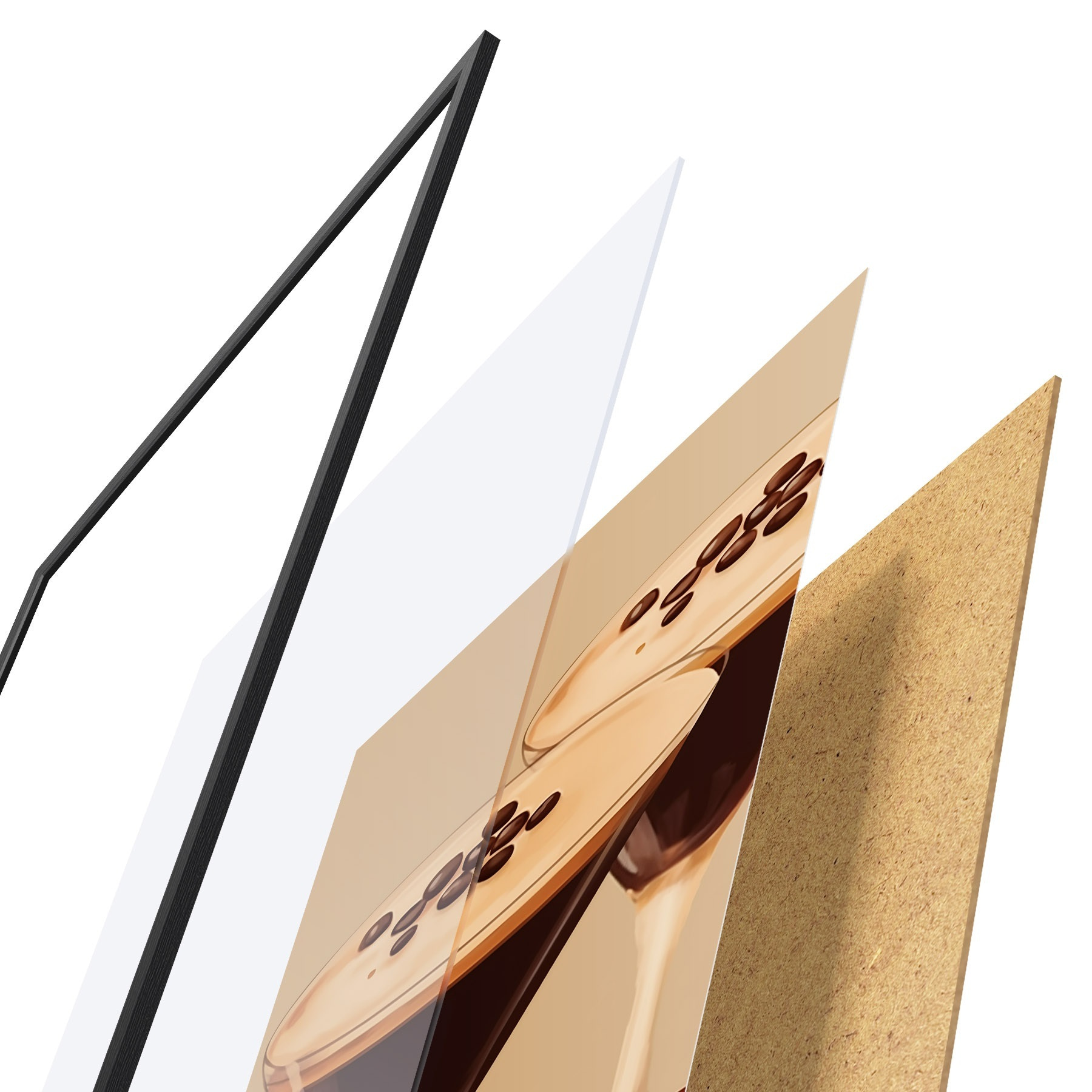 Plakatą sudaro rėmas, pleksiklas, atspausdintas vaizdas ir medžio drožlių plokštės pagrindas. Plakatą galima iš karto pakabinti ant sienos dėl kitoje pusėje esančių laikiklių.