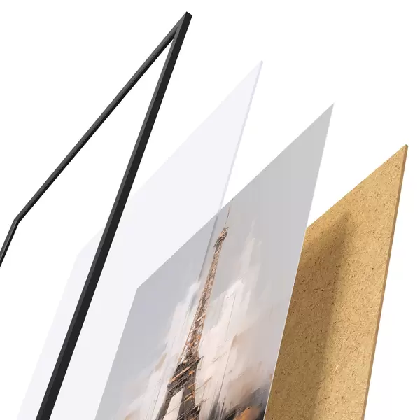 Plakatą sudaro rėmas, pleksiklas, atspausdintas vaizdas ir medžio drožlių plokštės pagrindas. Plakatą galima iš karto pakabinti ant sienos dėl kitoje pusėje esančių laikiklių.