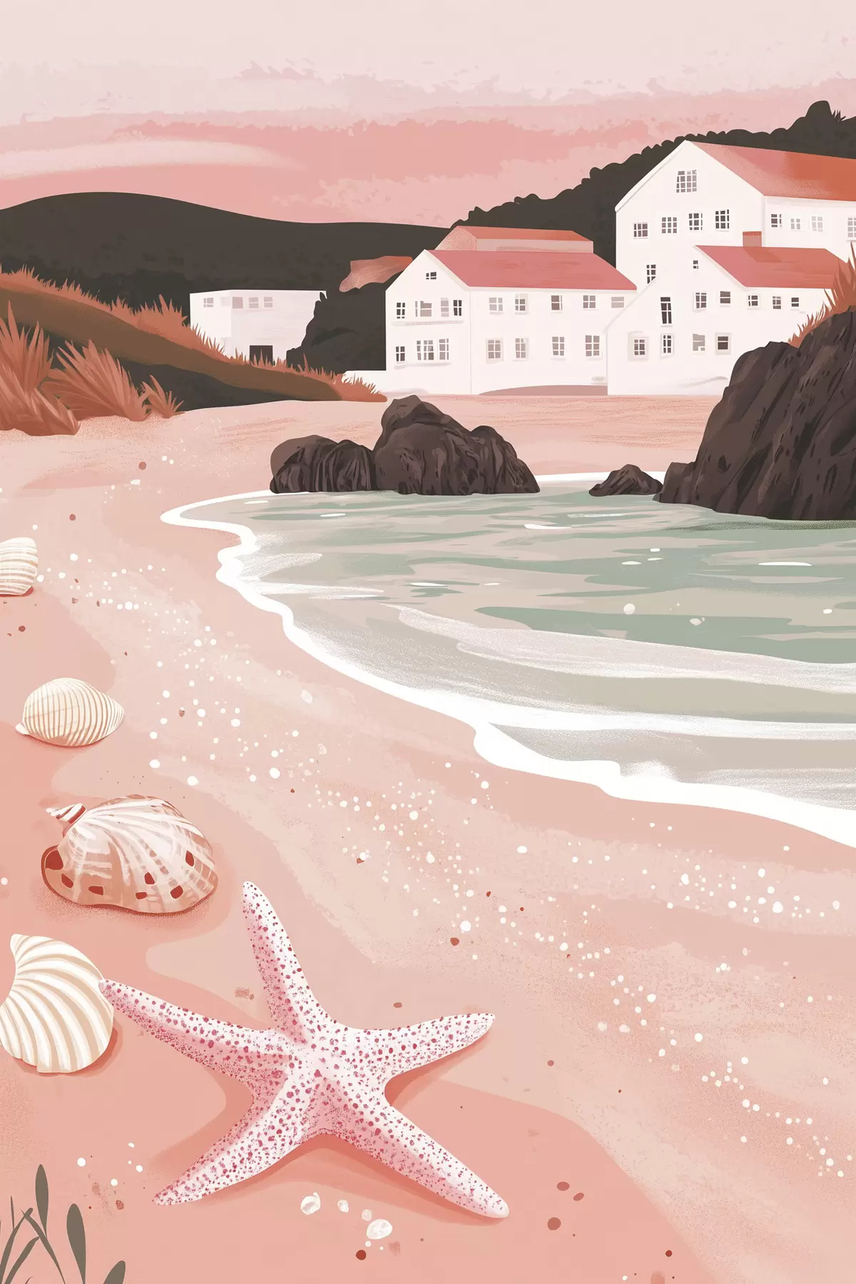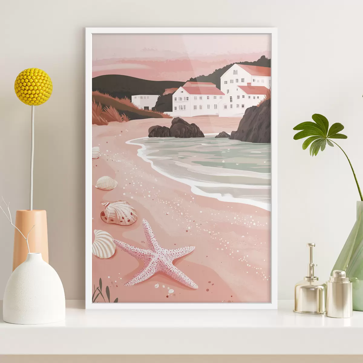 Plakatas Jaukus rausvas paplūdimys su baltais nameliais ir jūros kriauklėmis f44713