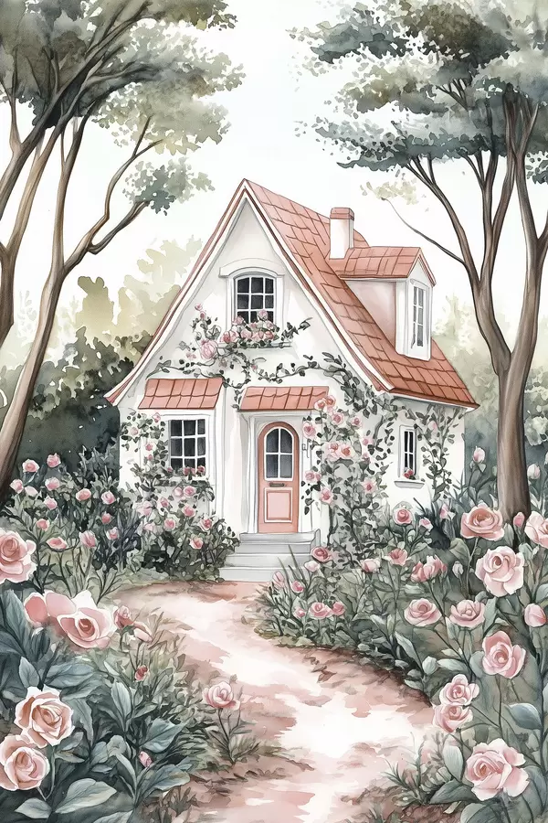 Plakatas Baltas namas su rožių sodu miške Ne f44716