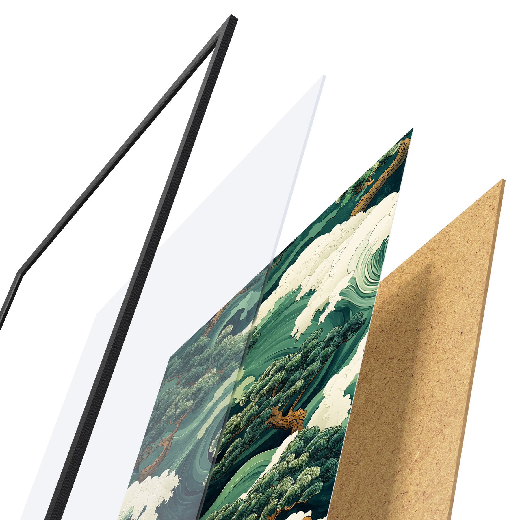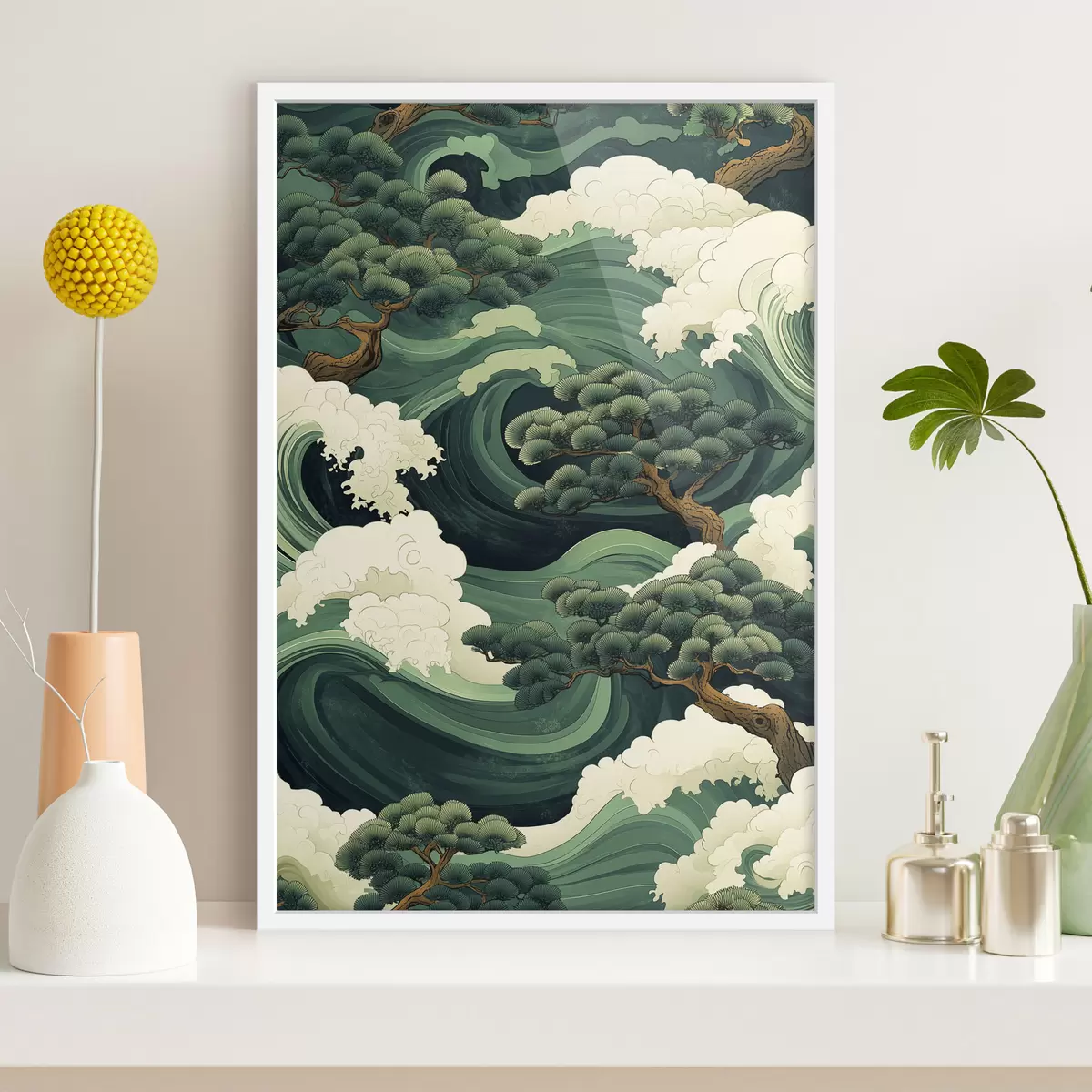Plakatas Kiniško stiliaus piešinys su jūros bangomis ir pušimis f44719