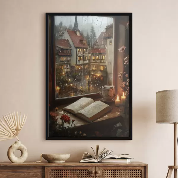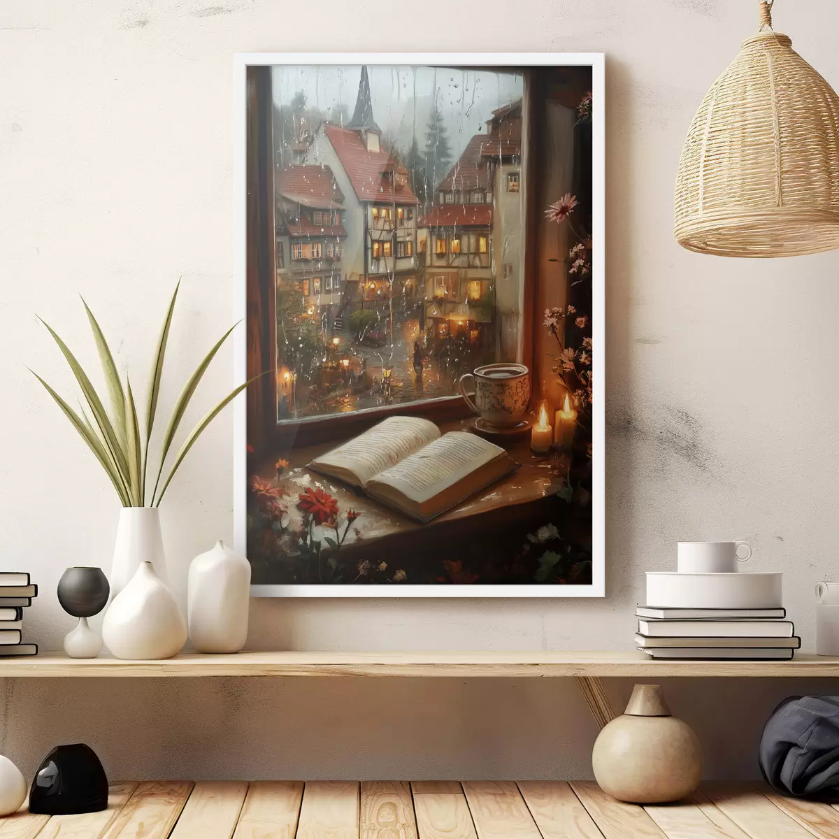 Plakatas Knyga ant palangės, žvakės, lietinga diena, jauku f44722