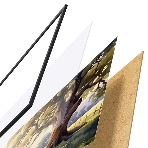 Plakatą sudaro rėmas, pleksiklas, atspausdintas vaizdas ir medžio drožlių plokštės pagrindas. Plakatą galima iš karto pakabinti ant sienos dėl kitoje pusėje esančių laikiklių.
