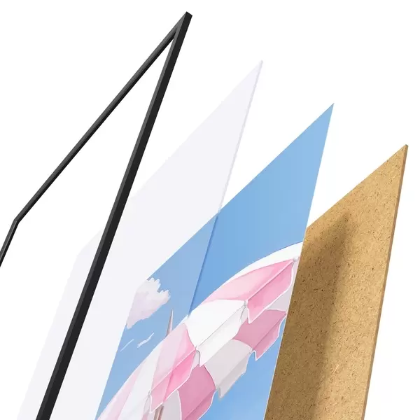 Plakatą sudaro rėmas, pleksiklas, atspausdintas vaizdas ir medžio drožlių plokštės pagrindas. Plakatą galima iš karto pakabinti ant sienos dėl kitoje pusėje esančių laikiklių.