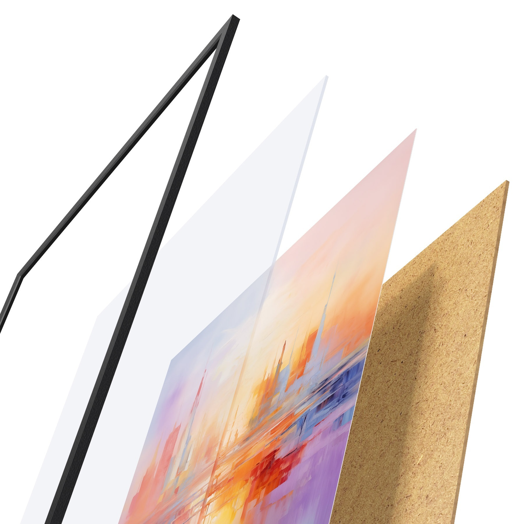 Plakatą sudaro rėmas, pleksiklas, atspausdintas vaizdas ir medžio drožlių plokštės pagrindas. Plakatą galima iš karto pakabinti ant sienos dėl kitoje pusėje esančių laikiklių.