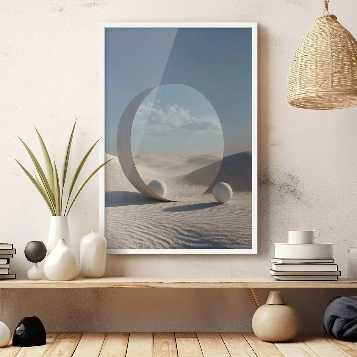 Plakatas Siurrealistinis dykumos kraštovaizdis su apvaliu veidrodžiu, kuriame atsispindi dangus ir mėnulis f44792
